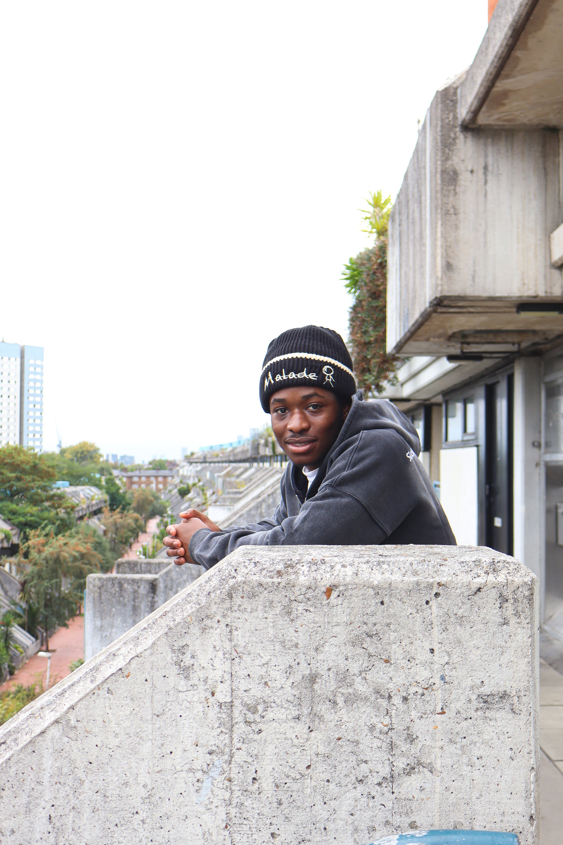 Cream outline across folded brim , with a cream malade logo + stickman.